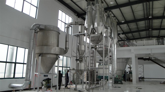 加热到一定温度后吹入直立管,在管内的速度决定于湿颗粒的大小和密度,一般大于颗粒的沉降速度(约为10~20米/秒)。已干燥的颗粒被强烈气流带出,送到两个并联的旋风分离器分离出来,经螺旋输送器送出,尾气则经袋式过滤器放空。由于停留时间短,对某些产品往往须采用二级或多级串联流程。